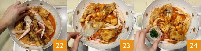 Drain the prawns and add them to the chicken in the pan 22, then also add the lemon juice 23, stir and a few minutes before turning off the heat, add the chopped parsley 24.