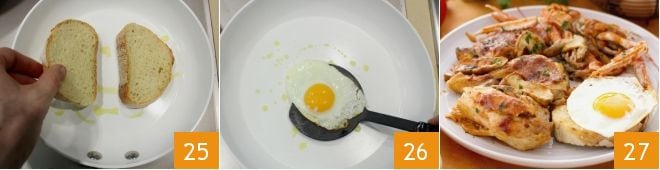 In a pan, pour 3 tablespoons of oil, toast the slices of bread 25 while in another pan fry the eggs for a few minutes with another two tablespoons of oil 26, salting them lightly. Then transfer the Chicken Marengo to a serving dish and place the toast on which you will lay the eggs 27.