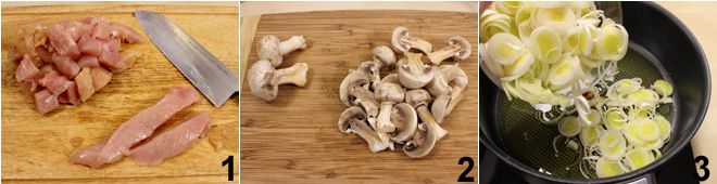 Meanwhile, prepare the pie filling: cut the chicken breast into cubes (as for a stew) 1, clean the leeks and slice them quite thinly, clean the mushrooms well and slice the larger ones (keep the smaller ones whole) 2. In a very large pan, heat the extra virgin olive oil, add the sliced leeks 3