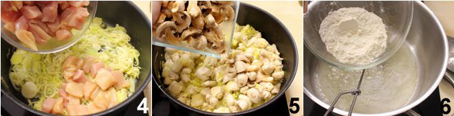 and let them wilt for at least 10 minutes. Then add the chicken 4, browning it well over high heat on all sides; finally, add the mushrooms 5. Deglaze with white wine and add salt. Then cook the chicken.