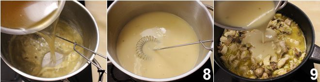 then add the chicken broth 7, continuing to stir to avoid lumps. Let it thicken over low heat 8 and then add this mixture to the chicken 9.