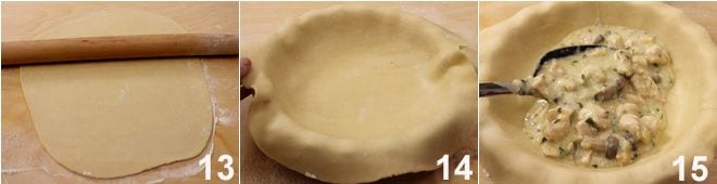 Then roll out the two pieces of shortcrust pastry into two sheets about 1/12 inch thick 13. Butter and flour a ceramic pie dish with a diameter of 9-10 inches, ideally quite deep and with fluted edges. Place the larger sheet on the pie dish 14, adhering well to the bottom and edges. Take the now cold chicken mixture and pour it into the pie dish 15, trying to form a 'mountain' in the center.