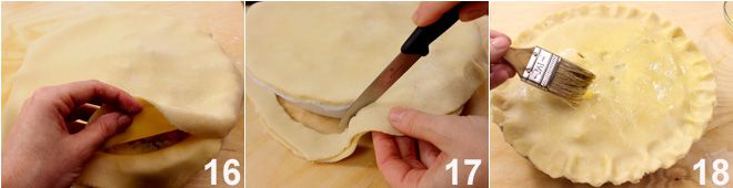 Then cover with the other sheet of dough 16. With a knife, remove excess dough from the edges 17 and press them with your fingers to adhere well. Make holes in the center of the pie and brush it with 1 beaten egg 18. If you want, you can create decorations with the leftover shortcrust pastry scraps.