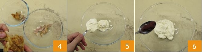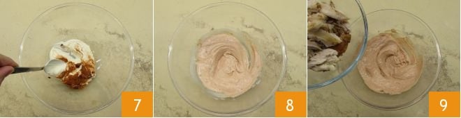Set the vegetables aside and deal with the roast chicken: remove the skin and bones and shred it, collecting it in a large bowl 4. You will need about 300 g (10.5 oz) of chicken. In another bowl, pour the Mayonnaise 5, a tablespoon of tomato paste 5, and 4 teaspoons of Cajun spice mix.