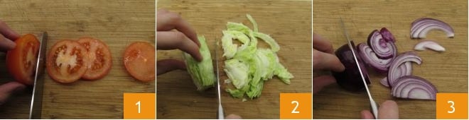 To prepare the chicken sandwich, first wash and thinly slice the vine tomatoes 1. Wash and julienne the iceberg lettuce 2, then peel and slice the red onion 3.
