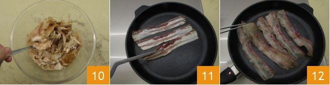 and stir to flavor it with the sauce 10. Set aside the chicken and heat a pan: when it's hot, place the bacon slices without overlapping and without adding any other fats 11 and brown them for 3 minutes, turning on both sides 12.