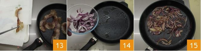 Once the bacon is ready, drain it on a tray lined with paper towels 13. In the same pan where you cooked the bacon, add the sliced onions 14 and cook them for about 3 minutes. Once they are well browned, turn off the heat and let them cool 15.