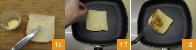 Now take the slices of sandwich bread: for each sandwich, butter one slice on both sides and 2 slices on one side only 16. Heat a pan and toast the slice of bread buttered on both sides 17 until golden brown 18.