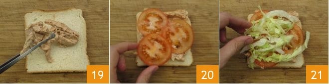 Now you can assemble the sandwich: take one of the two slices of bread buttered on one side only and fill with chicken 19, tomato slices 20, and julienned iceberg lettuce 21.