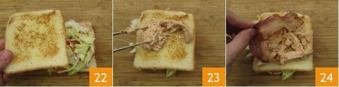 Cover with the freshly toasted slice 22 and continue filling with more chicken 23, bacon 24