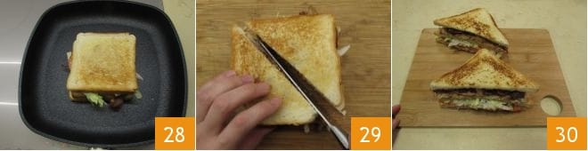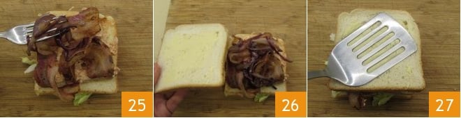 and onion 25. Cover with the other slice of bread buttered on one side only 26, press the sandwich with a spatula 27