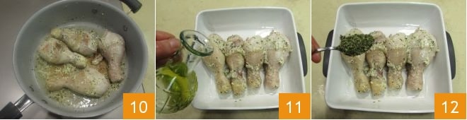 Cook the chicken over medium heat for about 10 minutes. Once the cooking time in the pan has passed 10, transfer the chicken to a baking dish, season with a drizzle of olive oil 11 and a teaspoon of oregano 12. Cook the chicken in a preheated static oven at 428°F (220°C) for about 20 minutes.