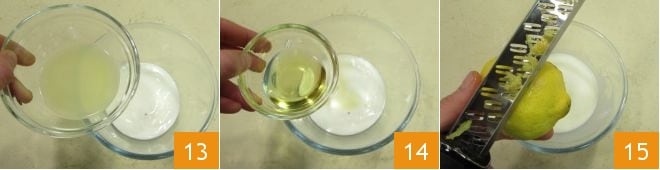While the chicken bakes in the oven, take care of the accompanying sauce: pour the yogurt into a bowl, add the lemon juice 13, the oil, a pinch of salt, and flavor with lemon zest 15