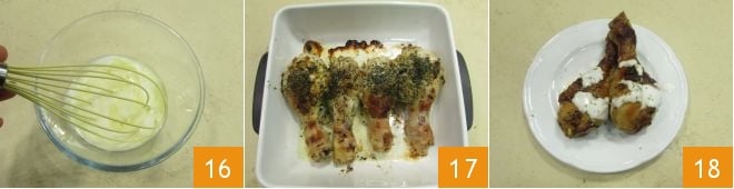 Mix the sauce to flavor it 16. In the meantime, the chicken will be cooked, take it out of the oven 17 and serve the chicken thighs with yogurt with the lemon-flavored sauce 18.