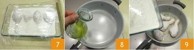 Wrap the bowl with plastic wrap 7 and place in the refrigerator to marinate for at least 30 minutes, turning them at least once. After the resting time, heat a drizzle of olive oil in a pan 8, lay the thighs and cover them with the yogurt marinade 9.