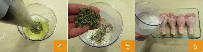 blend everything with an immersion blender 4 until you get a smooth sauce, then salt, pepper, and season with oregano 5, mix everything to flavor. Now place the chicken thighs side by side in a large bowl, cover the meat with the yogurt-based marinade 6, and turn them to moisten them completely.