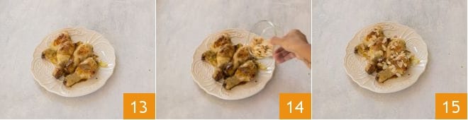 When the drumsticks are ready, transfer them to a plate 13, garnish with the almond slices 14, and serve 15.