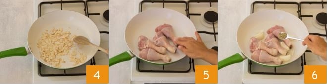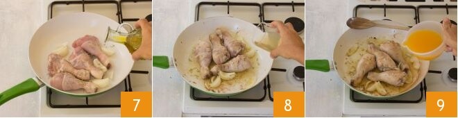 Then also pour in the oil 7 and brown the chicken for a couple of minutes. Then deglaze with the white wine 8 and wait for it to completely evaporate before adding the orange juice 9.