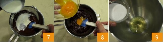 When the chocolate has completely melted, remove it from the double boiler and add the hot cream in a thin stream 7. Setting aside the egg whites, add the egg yolks, carefully mixing the mixture 8. Separately, place the egg whites and sugar in a stand mixer 9,