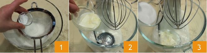 To prepare the cupcakes, start with the white heart batter: melt the white chocolate in a bain-marie. Then sift the flour with the baking powder in a bowl. Next, in the bowl of a stand mixer, pour the melted butter 2 and add the sugar 3 and cream the ingredients.
