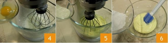 Then add the egg yolk 4, and once incorporated, also pour in the previously melted white chocolate 5. Transfer the mixture into a small bowl and add the sifted flour with the baking powder 6.