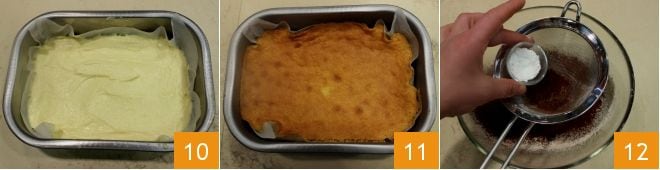 to spread it evenly over the entire surface of the baking tray 10. Then bake in a preheated static oven for 15 minutes at 355°F. When it's cooked and well golden on the surface, take it out and let it cool 11. Then proceed to the chocolate and coffee cupcake batter: melt the dark chocolate in a bain-marie. Then sift the flour into a bowl, add the unsweetened cocoa and baking powder 12. Then repeat all the steps to make the batter as shown in the photo sequence from 1 to 4 (cream the melted butter with the sugar, add the eggs one at a time). Set the mixture aside for a moment and prepare the coffee to add to the cupcake batter.