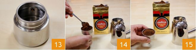 Put cold water, preferably low in calcium, inside the boiler up to the safety valve 13 (otherwise, you'll get a longer coffee). Fill the filter with ground coffee 14 and level each teaspoon of coffee added by tapping the filter on the table with decisive movements 15, until you reach the edge of the filter.
