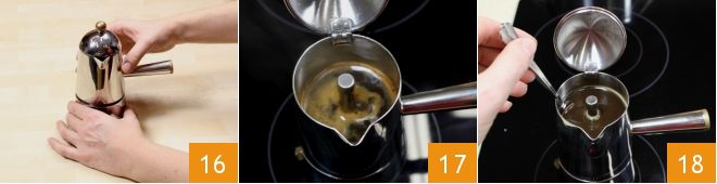 Do not press with the teaspoon, nor make holes, and screw the coffee maker tightly 16 (to prevent the coffee from coming out from the sides while it rises), then place it on a low and steady flame to obtain a rich coffee. As the coffee rises, a dense foam will form 17; we recommend not letting the coffee gurgle too long to keep its aroma and sweetness intact. Then turn off the heat, and your coffee to use in the preparation is ready: stir it directly in the moka with a teaspoon to make it more homogeneous 18.