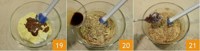 At this point, place the obtained mixture in a small bowl, add the melted dark chocolate 19, and pour in 0.35 oz of the coffee you made 20. Also, add the dry ingredients 21.