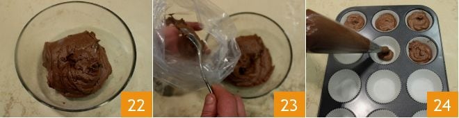 Mix the ingredients to obtain a homogeneous mixture 22. Then fill a piping bag with the help of a spoon 23. Take a 12-cup muffin tin, insert paper liners in each space, and then fill the mold to 3/4 with the batter 24.