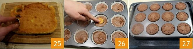 At this point, you can unmold the white batter: place it on a cutting board and use a 0.8-inch round cutter to cut out rounds 25. Place the rounds of white batter in the center of each cupcake 26, letting them sink into the dark batter. Then bake the chocolate and coffee cupcakes with a white heart in a static oven at 340°F for 15-20 minutes, checking the doneness with a toothpick. Once baked, let them cool 27 and voilà: your chocolate and coffee cupcakes with a white heart are ready!