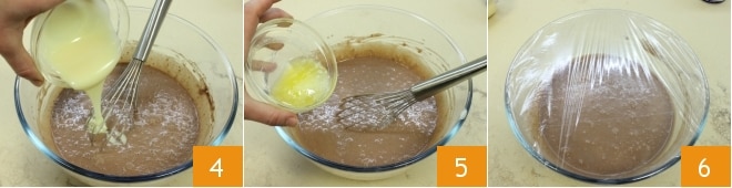 Now incorporate the condensed milk and continue mixing 4. Separately, melt the butter, let it cool, and then add it to the mixture 5, cover the bowl with plastic wrap 6 and let the batter rest in the refrigerator for a couple of hours.
