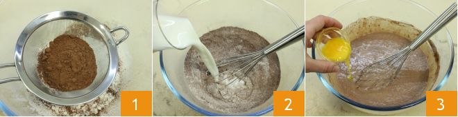 To make the chocolate and passion fruit waffles, sift the flour, baking powder, and cocoa powder into a bowl 1, pour in the milk while stirring with a whisk 2. Separate the yolk from the egg white and add the yolk to the mixture 3, making sure to keep the egg white.