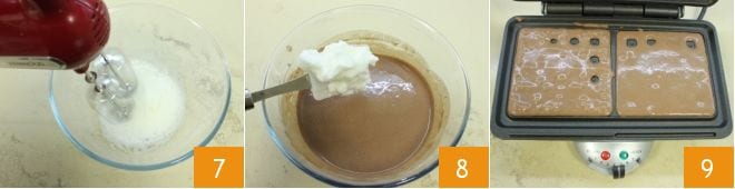 After the resting time, beat the egg white you set aside to stiff peaks 7 and gently fold it into the waffle batter 8. At this point, proceed with the cooking: heat a waffle iron, pour the batter into the designated mold with a ladle until the entire mold is filled 9.