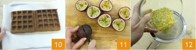 Close the iron and cook the batter for about 5 minutes or as indicated by your iron. Once cooked, remove them and let them cool slightly 10. Now focus on the sauce: cut the passion fruits in half 11, extract the pulp and strain it through a sieve to remove the seeds and collect it in a bowl 12,