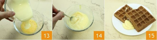 add the condensed milk 13 and stir to obtain a thick and homogeneous sauce 14. Place your chocolate waffles on a serving plate and accompany them with the passion fruit sauce 15.