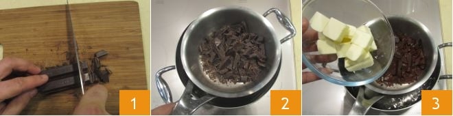 To make the brownie sandwiches, start with the brownie batter: coarsely chop the chocolate 1, place it in a double boiler 2, add the butter in pieces 3, and completely melt the chocolate over low heat.