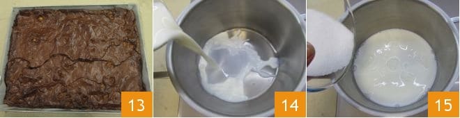 bake in a preheated static oven at 356°F for 20 minutes, once baked, take the base out of the oven and let it cool 13, then unmold it and place it in the refrigerator, once cold it will be easier to cut without crumbling. In the meantime, prepare the milk cream: heat 1¾ cups of milk in a saucepan 14, add the sugar 15.
