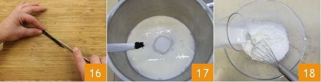 Slice the vanilla pod lengthwise and extract the seeds by scraping with a knife 16; add them to the milk 17, meanwhile dissolve the cornstarch in ⅓ cup of cold milk 18