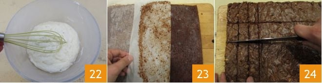 After this time, take out the cream that will have thickened well 22, put it in a piping bag, and store it in the fridge. Take the brownie base out of the fridge, remove the parchment paper 23, trim the edges of the brownie, and cut it into 40 rectangles measuring 1x2½ inches 24.