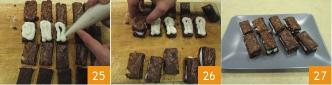 Fill one rectangle by squeezing the milk cream 25, close it with another rectangle to create a sandwich 26, continue until you finish the brownies 27. Keep them in the refrigerator until ready to serve.