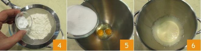 Sift the flour with the baking powder 4, in the bowl of a stand mixer fitted with a whisk, place the whole eggs and sugar 5, and whip until you obtain a light and frothy mixture 6,