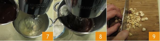 pour the chocolate into it 7 while whipping, then add the sifted dry ingredients one tablespoon at a time 8, without stopping the mixer. Coarsely chop the hazelnuts 9