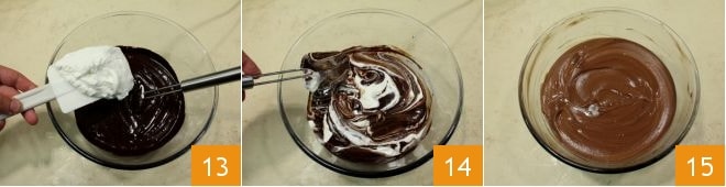 add the whipped cream gradually to the cooled chocolate mixture 13, mixing from bottom to top to prevent it from deflating 14; continue stirring until you achieve a smooth and homogeneous consistency 15.