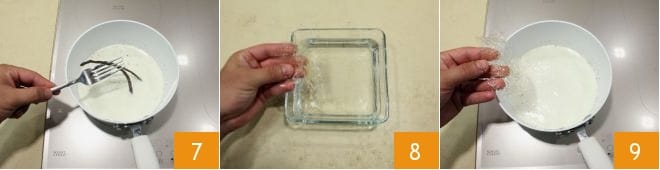 Split the vanilla pod lengthwise and extract the seeds by scraping it with a small knife 4. Put a saucepan with milk 5 on the stove along with the seeds and the whole vanilla pod 6.