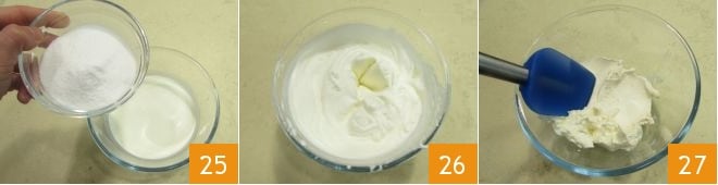 While the cake is baking, you can prepare the accompanying cream: pour the fresh cream into a bowl, add the sugar 25, and whip it to soft peaks with the electric whisk 26. In a separate bowl, work the mascarpone with a spatula to soften it 27,