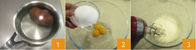 Now take the bowl with the egg whites and whip them to stiff peaks with the electric whisk 4 until they reach a firm consistency 5, then store them in the refrigerator. As soon as the potato is well cooked, drain it and let it cool, then peel it 6.
