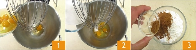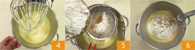 When you have obtained a well-beaten and frothy mixture 4, turn off the mixer and sift the cinnamon and corn starch mix inside 5. Incorporate the powders with a hand whisk 6.