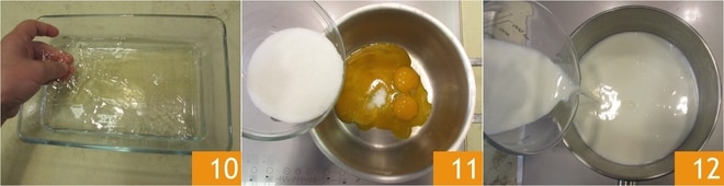 In the meantime, prepare the custard: soak the gelatin sheets in cold water 10, then pour the egg yolks and sugar into a saucepan 11 and mix with a spatula. Meanwhile, heat the milk in another saucepan 12.