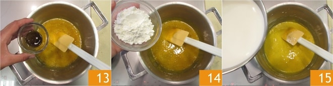 After mixing the yolks well with the sugar, add the vanilla extract 13 and corn starch 14 and mix again with the spatula. When the milk comes to a simmer, add it in several additions to the yolk mixture 15.